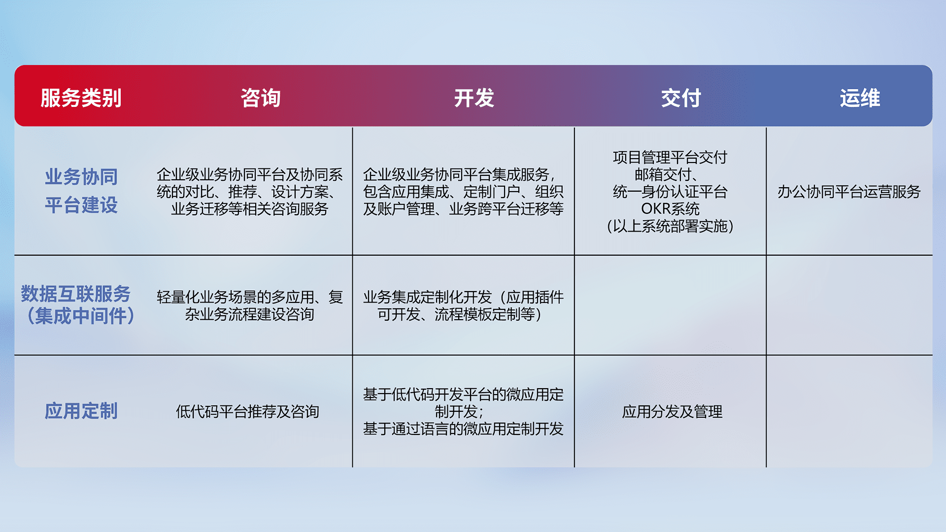 针对钉钉、、、、企微、、、IDaas等平台级产品提供产品的规划、、方案、、交付、、、、定制化开发等服务,,,实现如统一协同办公、、、、智能客户服务、、混合会议管理、、、智能数据查询、、、等业务场景,,实现数字化转型。。。。